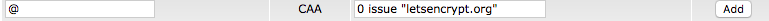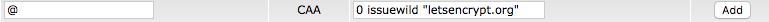 Vervolgens zie je alle DNS records van je domeinnaam staan, onderaan de pagina kan je een CAA record toevoegen. Wanneer je enkel wilt toestaan dat Let's Encrypt SSL certificaten voor je mag uitvragen dan voer je de volgende waarde in: 0 issue “letsencrypt.org” (zie voorbeeld hieronder)