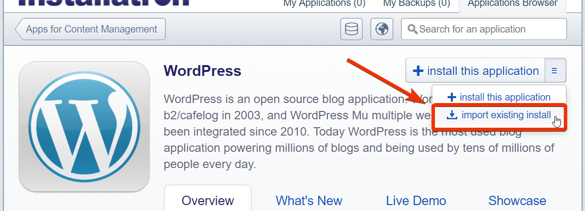Je klikt hiervoor zoals onderstaand word weergegeven op het pijltje en kiest voor “import existing install”.