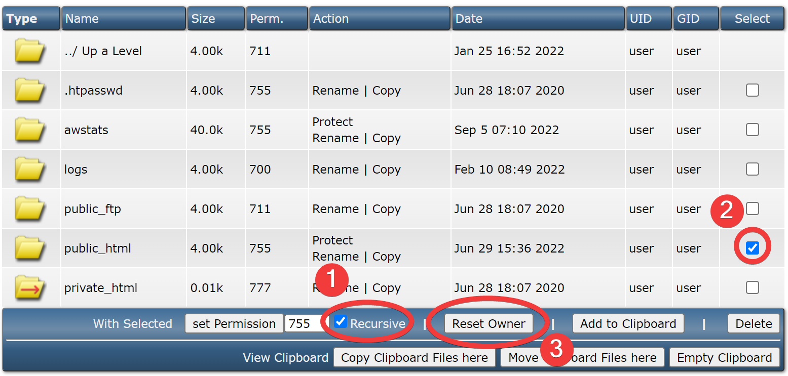 Hierna dien je de public_html te selecteren, zie afbeelding hieronder. Vervolgens klik je recursive aan en daarna kan je op “Reset Owner” klikken.