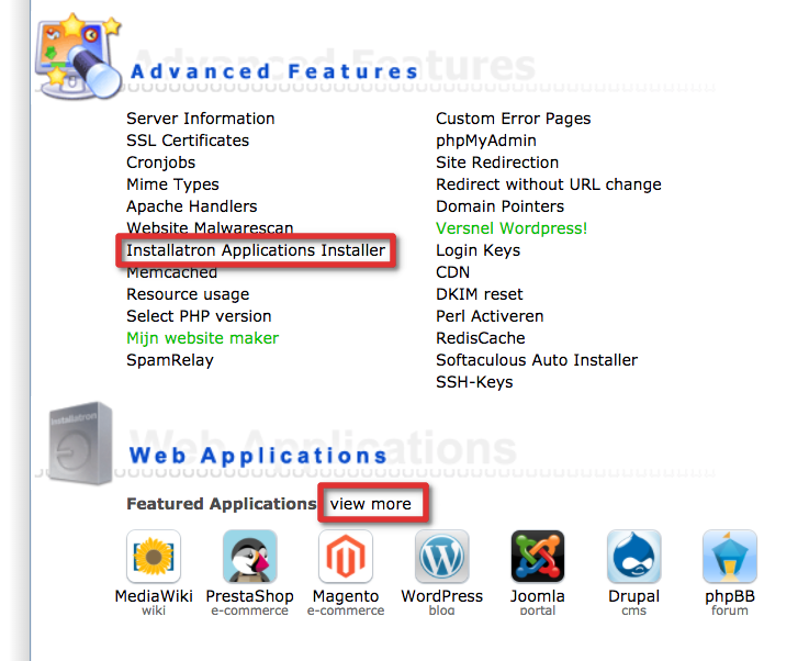 Scroll daarna helemaal naar onder totdat je bij de Installatron applicatie uit komt, klik naast “Featured Applications” op “view more” of klik op de link “Installatron application installer”.