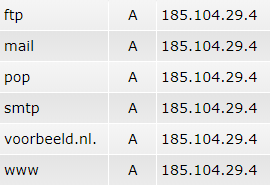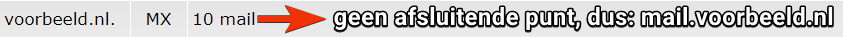 Standaard zal dit naar mail staan, zodat je email naar je lokale mailserver verwezen wordt. De A en AAAA records voor mail.voorbeeld.nl wijzen namelijk standaard naar de server waarop je het domein host.