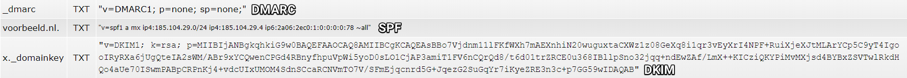 Hoewel TXT records geen actieve rol spelen, zijn er toch enkele records met een vaste functie voor de email afhandeling. Dit zijn de DMARC, SPF en DKIM records.