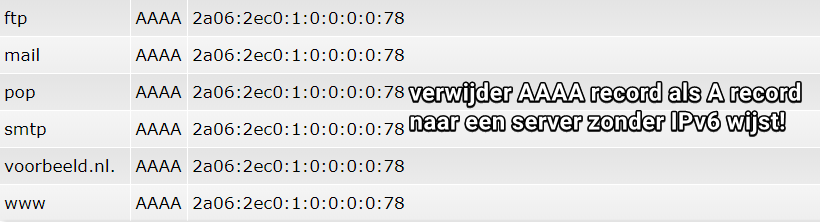 Wanneer je met een A record naar een externe server wijst waar geen IPv6 beschikbaar is, dien je de overeenkomende AAAA record te verwijderen. Als je dit niet doet, zullen sommige bezoekers namelijk over IPv6 verbinden en bij onze server uitkomen.