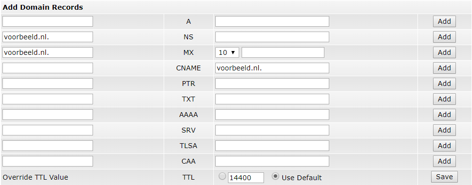 Je kunt je DNS in DirectAdmin aanpassen onder DNS management. Onderaan deze pagina zie je de invoer velden voor de DNS records.