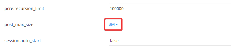 Stel nu, dat we de instelling post_max_size willen wijzigen, hoe doen we dat? Allereerst, klik op de huidige waarde voor die instelling. Deze is weergegeven in het blauw, 8M in de afbeelding.