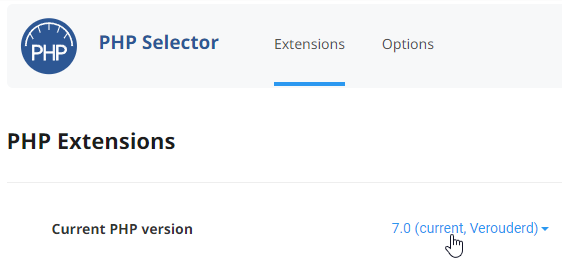 Wanneer je dat hebt gedaan krijg je meteen de optie om de PHP versie te veranderen. Je klikt op de huidige PHP versie, 7.0 in dit geval. Je krijgt een dropdown menu te zien met de beschikbare versies, je selecteert de versie die jij wilt gebruiken.