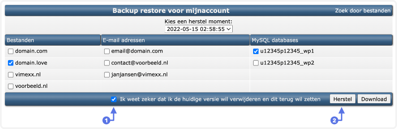 Je komt hierna op de pagina terecht waar je de backups kunt herstellen. Je kan hier zelf een herstelmoment selecteren en vervolgens aangeven of je de bestanden, emails en/of databases wenst te herstellen.