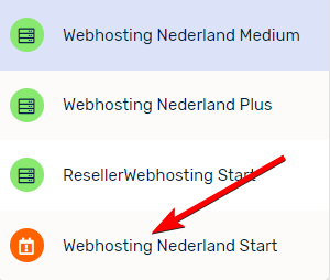Aan de linkerkant zie je een overzicht van jouw hostingpakketten staan. Het verlopen pakket wordt aangegeven met een oranje icoon.