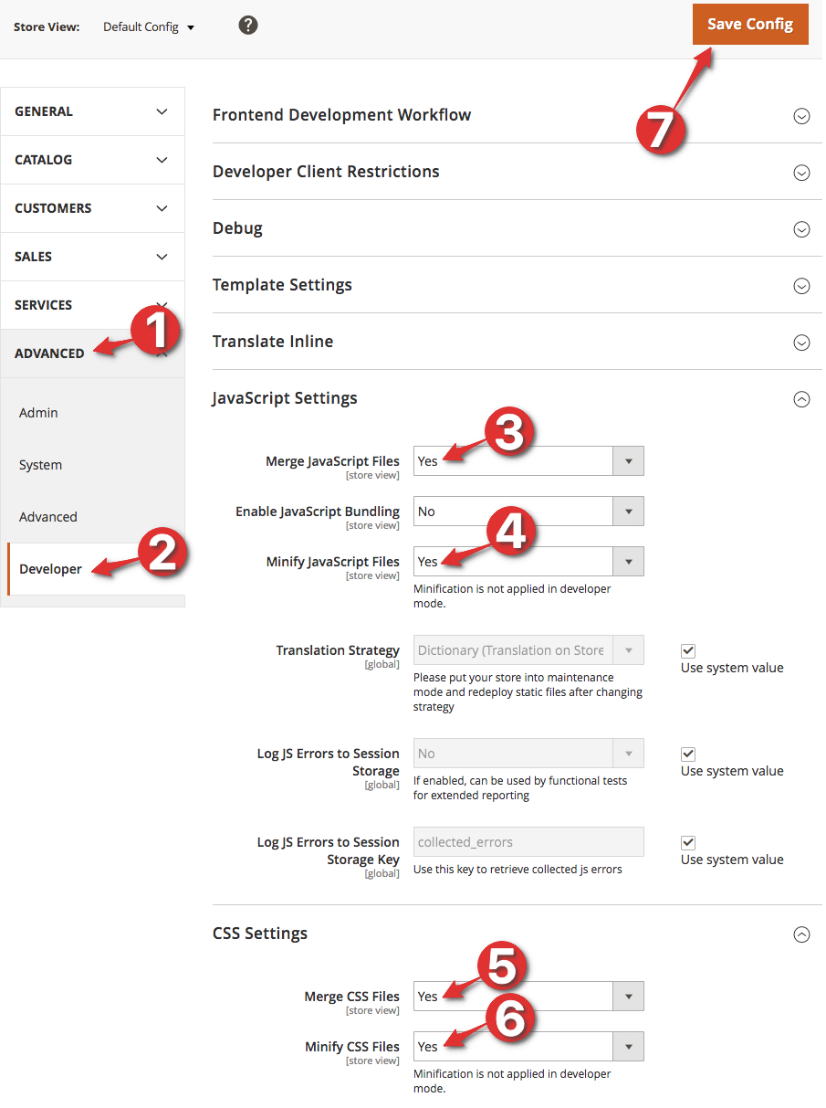Weer zie je aan de rechterkant verschillende opties, klik hierbij op “JavaScript Settings” en op “CSS Settings”. Onder “JavaScript Settings” zet je “Merge JavaScript Files” en “Minify Javascript Files” beiden op “Yes”. Bij “CSS Settings” zet je “Merge CSS Files” en “Minify CSS Files” ook beiden op “Yes”. Vervolgens sla je dit op door op “Save Config” te klikken. Ook zal je bij deze wijzigingen een melding krijgen die je kunt negeren.
