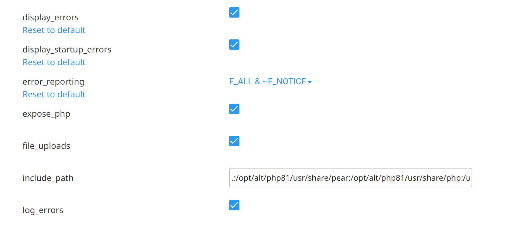 Je zet in dit configuratie scherm de volgende acties aan door erop te klikken en te wijzigen naar “On” en error_reporting zet je naar E_ALL.