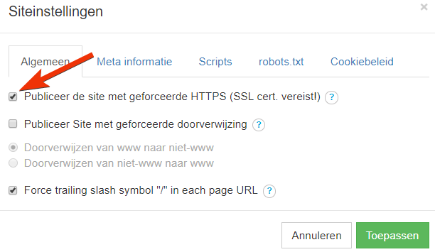 Vink nu de optie Publiceer de site met geforceerde HTTPS (SSL cert. vereist!) aan. Druk hierna op Toepassen en vervolgens op Publiceren.