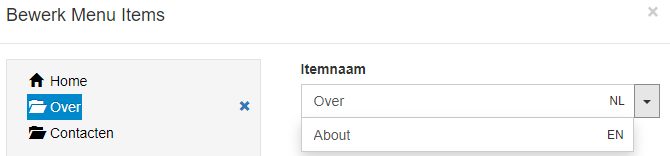 Als je op het pijltje naast de itemnaam klikt, zullen er vakken getoond worden voor de alternatieve talen. Hier kan je gewoon de gewenste tekst invoeren voor het menu item in een andere taal.