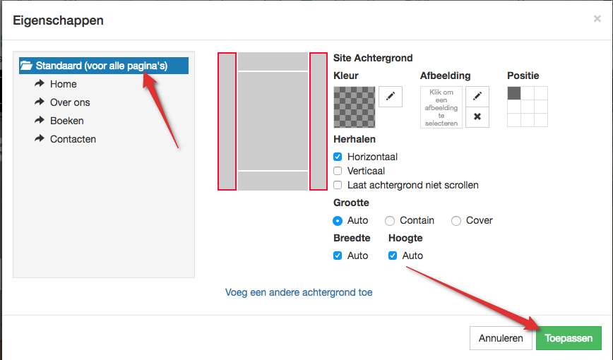 Selecteer nu op welk pagina’s je de achtergrond wilt instellen, je kan kiezen voor “Standaard voor alle pagina’s” of je kan een aparte pagina selecteren. Als je verkiest dat de achtergrond niet scrolt, vink dan “Laat achtergrond niet scrollen” aan. Klik hierna op “Toepassen”.