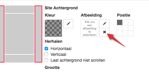Wanneer je een template gekozen hebt welke geleverd is met een afbeelding als achtergrond, verwijder dan deze door onder “Afbeelding” op het kruisje te klikken.