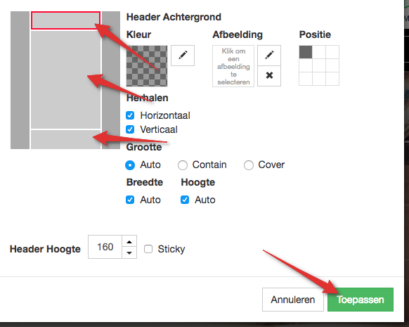 Je kunt nu ook (eventueel) de header, het middenstuk en de footer een kleur geven. Dit doe je door in de grijze rechthoek op het betreffende gedeelte te klikken. Klik hierna onder “Kleur” op het potloodje en kies uw kleur in het vak. Herhaal dit voor alle pagina’s (als je niet voor “Standaard” gekozen hebt). Wanneer je alles naar wens hebt aangepast, kun je op “Toepassen” klikken om het definitief op te slaan.