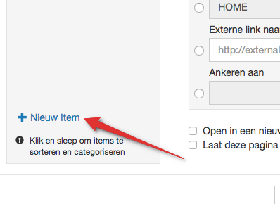 Het toevoegen van een nieuw menu item zorgt er ook gelijk voor dat je een nieuwe pagina aanmaakt. Je kunt een nieuw item maken door te klikken op “Nieuw item”.