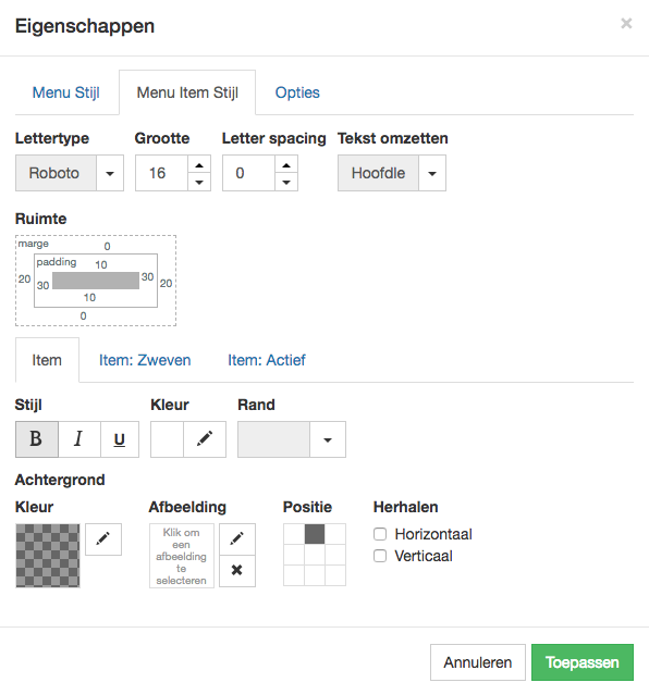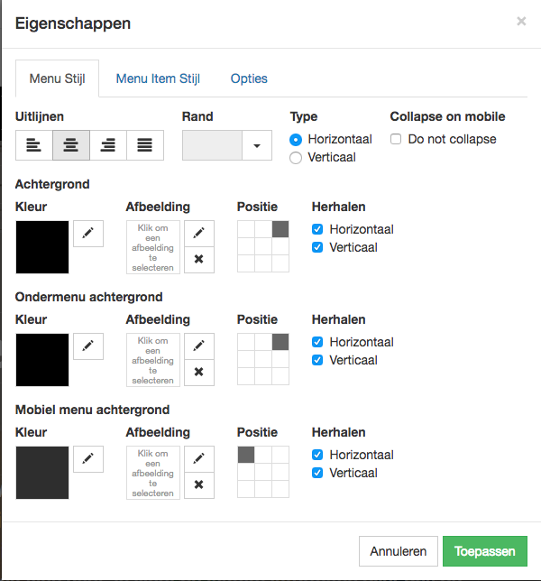 In het tabblad “Menu Stijl” heb je de mogelijkheid de verschillende eigenschappen van het menu aan te passen zoals het uitlijnen van de tekst, de kleur van de achtergrond en de rand. Onder “Type” kun je kiezen of je gebruik wilt maken van een horizontaal of verticaal menu.