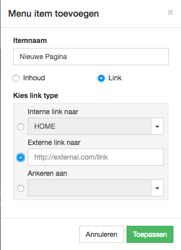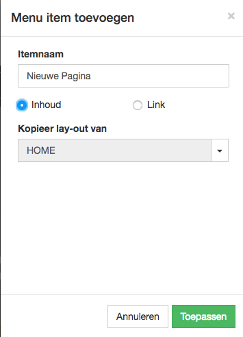 Je krijgt nu een nieuw venster te zien waar je de naam van het item/pagina kunt invoeren. Tevens krijg je de keuze van welke pagina je de layout wilt kopieëren voor de inhoud óf dat je het menu item ergens anders naar toe wilt linken.