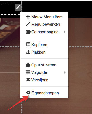 Om het uiterlijk / de stijl van het menu te bewerken dien je terug te gaan naar je overzicht. Daar klik je in dit geval weer op het grijze vakje met een potloodje en kiezen we voor de optie “Eigenschappen”.