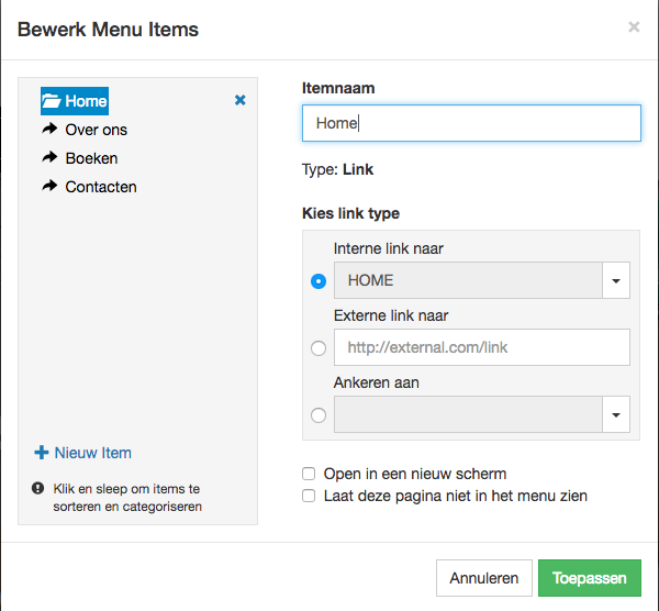 Je kunt de verschillende menu item's ook in een andere volgorde zetten indien gewenst. Dit kun je simpelweg doen door het item te verslepen naar de gewenste positie.