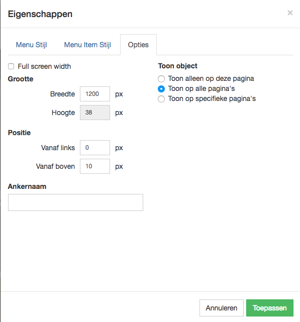 Wanneer je klikt op het tabblad “Opties” kun je de grootte en de positie van het menu ingeven. Onder “Toon object” kun je kiezen of het menu op alle pagina’s of enkel op deze pagina moet vertoond worden.
