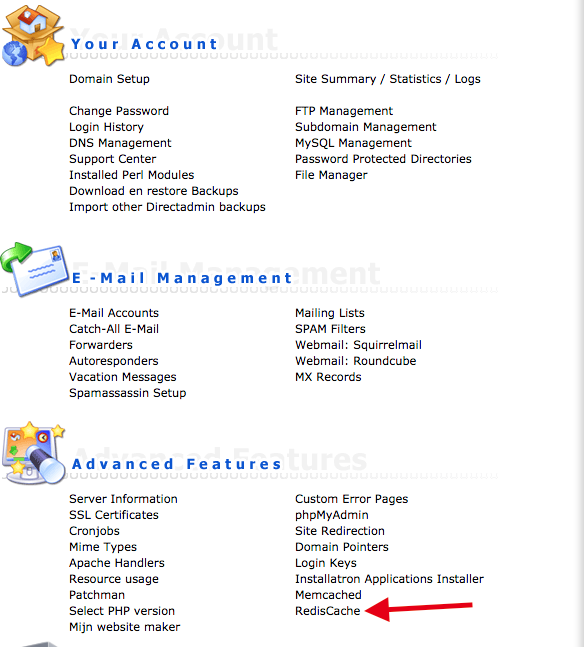 We gaan daarom nu eerst naar ons DirectAdmin controlepaneel waar we inloggen. Eenmaal ingelogd, zie je helemaal onderaan Rediscache staan. Hier klik je op.