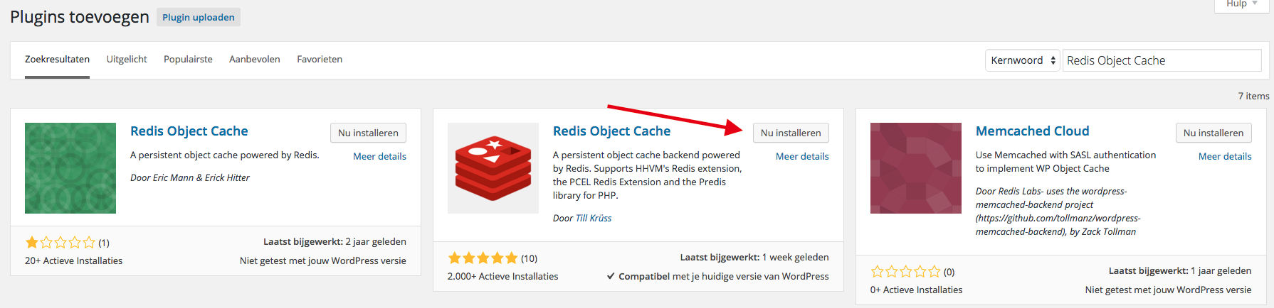 We openen hiervoor de Wordpress backend, via jouwdomein.nl/wp-admin . Eenmaal ingelogd, klikken we op Plugins → en hier weer op Nieuwe plugins. Hier voeren we rechtsboven in het zoekformulier in: Redis object cache . Als je op zoeken klikt, zie je vervolgens een soortgelijk resultaat.