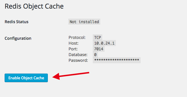 We klikken nu op de blauwe knop: Enable object cache. We schakelen hiermee Redis in op je eigen Wordpress installatie.