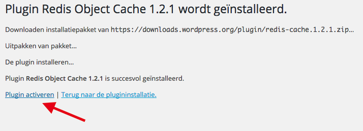 Hier klikken we als je Redis object cache ziet staan op de knop: Nu installeren. De plugin zal zichzelf vervolgens volledig automatisch installeren. Na de installatie, zie een scherm waarin dit ook bevestigd word. Hier zie je ook een linkje, genaamd plugin activeren. Hier klik je weer op.