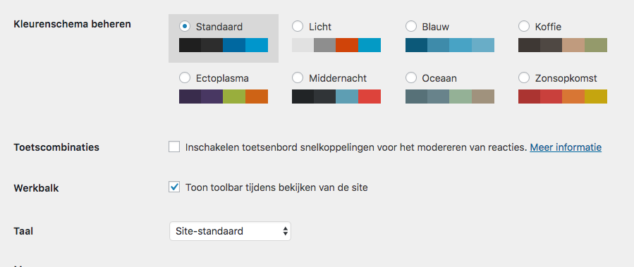 Zo heb je bijvoorbeeld de mogelijkheid om het kleuren schema van de wp-admin aan te passen.