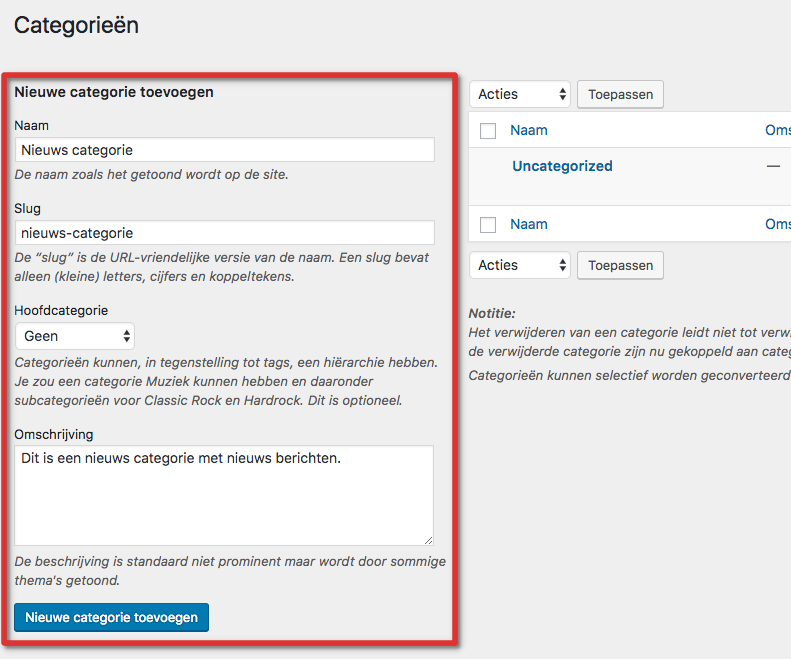 Gebruik het formulier wat je ziet om een nieuwe categorie aan te maken. Voer hier de door jouw gewenste gegevens in en klik onderaan op “Nieuwe categorie toevoegen”.