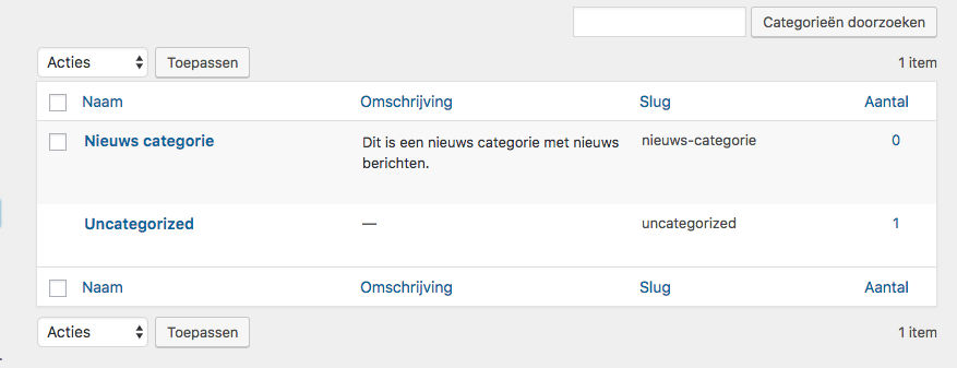 Zodra je de nieuwe categorie toegevoegd hebt, komt deze rechts in het overzicht te staan.